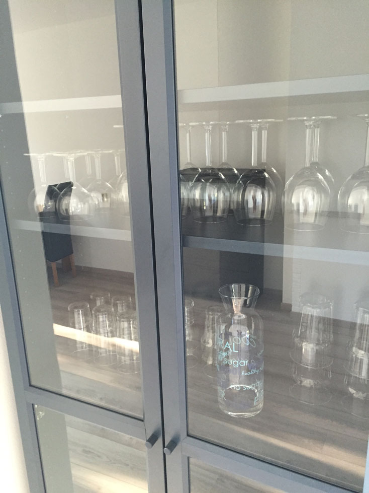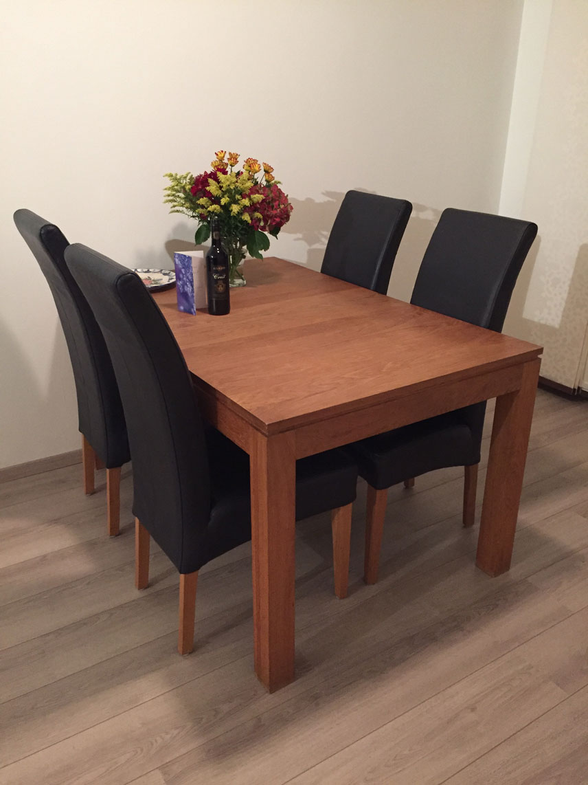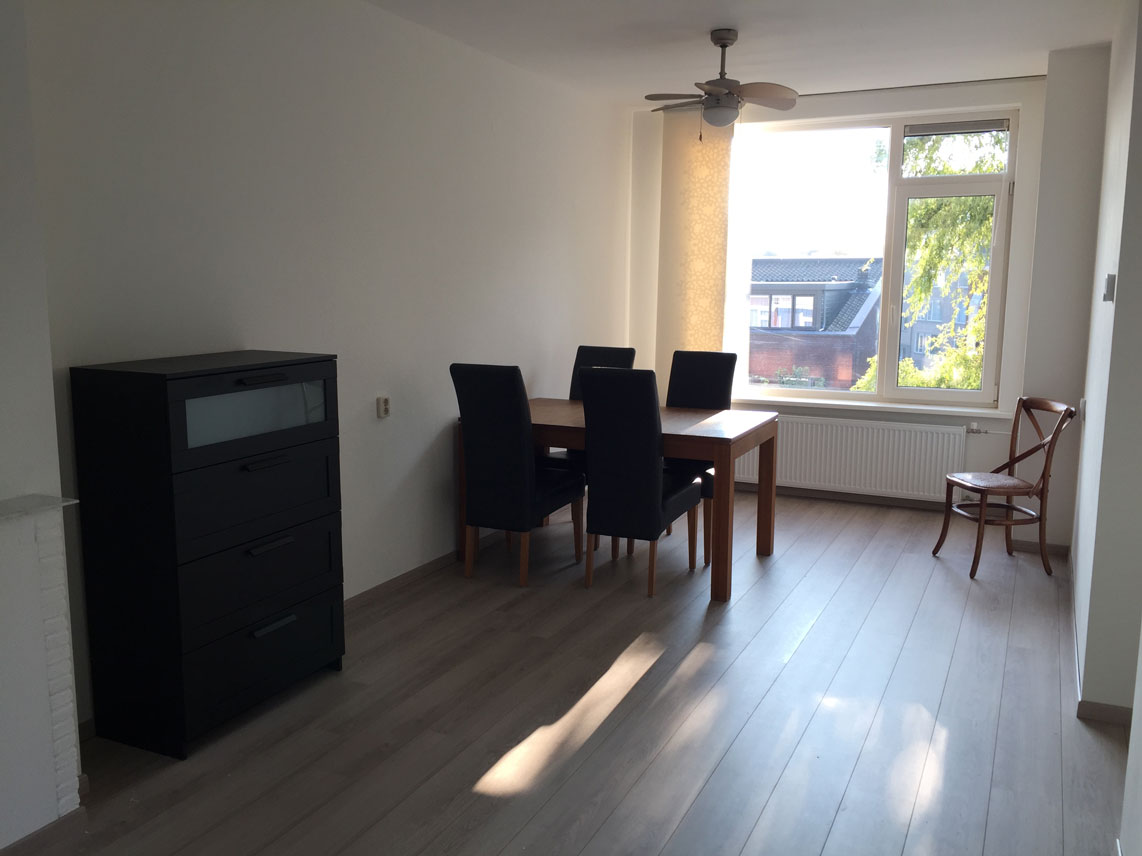 The large sunny living room has a beautiful 'French balcony' on the front side. The room is very light due to big windows at both the front side and the back side. On the front side a nice view into a green park may give you the impression of living in the countryside. The dining table in the back of the living room can be enlarged.